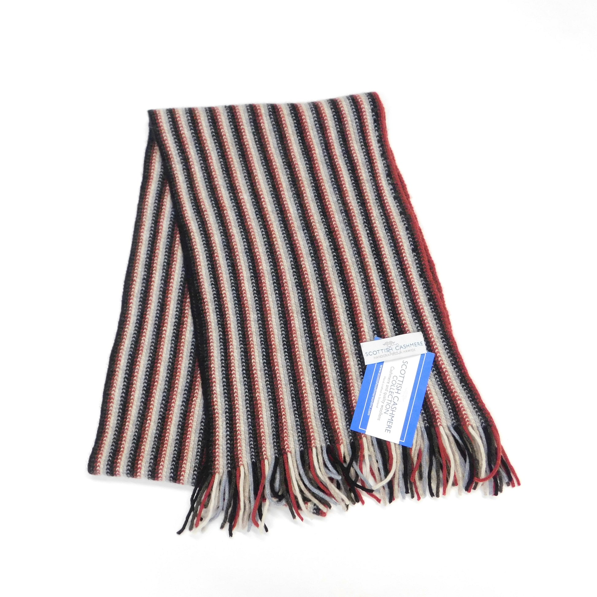 Timeless stripes. Effortless luxury. This cashmere scarf is hand-crafted in Hawick, Scotland—renowned for fine knitwear. The warp-knitted construction delivers a smooth drape and lasting shape, while the soft cashmere keeps things warm without weight.